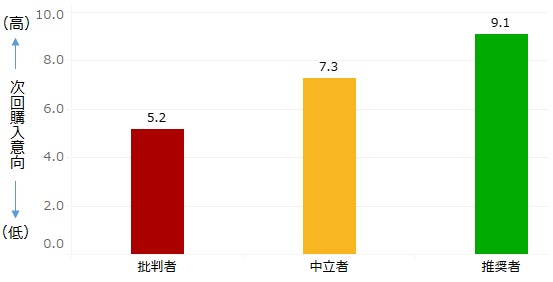 対象の自動車ブランドにおける次回購入意向を0~10の11段階でたずねたところ、「推奨者」(推奨度が「9」~「10」の回答者)は平均9.1ポイント、「中立者」(推奨度が「7」~「8」の回答者)は平均7.3ポイント、「批判者」(推奨度が「0」~「6」の回答者)は平均5.2ポイントとなり、推奨度が高いほど次回購入意向も高くなる結果となりました。