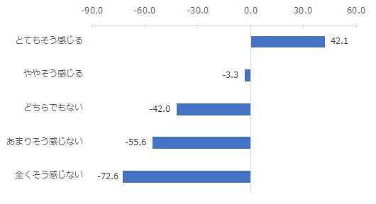 これらの自動車業界における不正問題に対して、該当のブランドは誠実な姿勢や対応を取っていると感じるか調査したところ、「とてもそう感じる」と回答した人は11.2%、「ややそう感じる」と回答した人は34.5%となりました。これらの回答別にNPSも分析をしたところ、「とてもそう感じる」と回答した人のNPSは42.1ポイント、また「ややそう感じる」と回答した人も-3.3ポイントとなり、肯定的な回答をした人のNPSは高くなりました。自動車の不正問題などに対して誠実な姿勢や対応を取ることがロイヤルティ低下を防ぐことにつながることがうかがえる結果となりました。