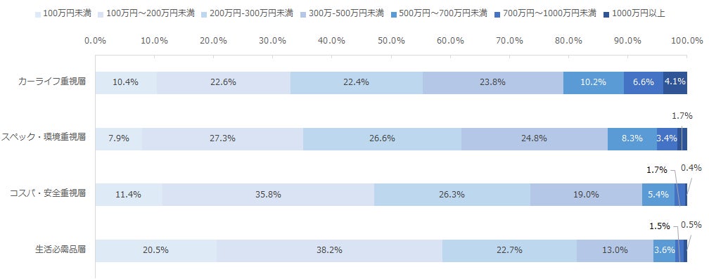 現在所有している自動車の購入金額を各クラスター別に分析したところ、「生活必需品層」や「コスパ・安全重視層」においては100万円未満や100万円~200万円未満の金額帯の自動車を所有している割合が高くなった一方、「スペック環境重視層」や「カーライフ重視層」においては300万円~500万円未満の自動車を所有する割合が高い傾向がみられました。また、「カーライフ重視層」では1,000万円以上の自動車を所有する割合も他クラスターに比較して高くなり、クラスターごとに所有している自動車の金額に差異がみられました。