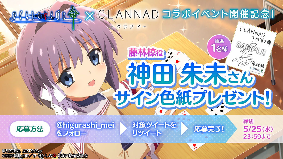 スマートフォンゲーム「ひぐらしのなく頃に 命」にて「CLANNAD」とのコラボイベント第2弾を開催中!本日よりコラボ限定カード第2弾が登場!コラボガチャは1日1回無料!!