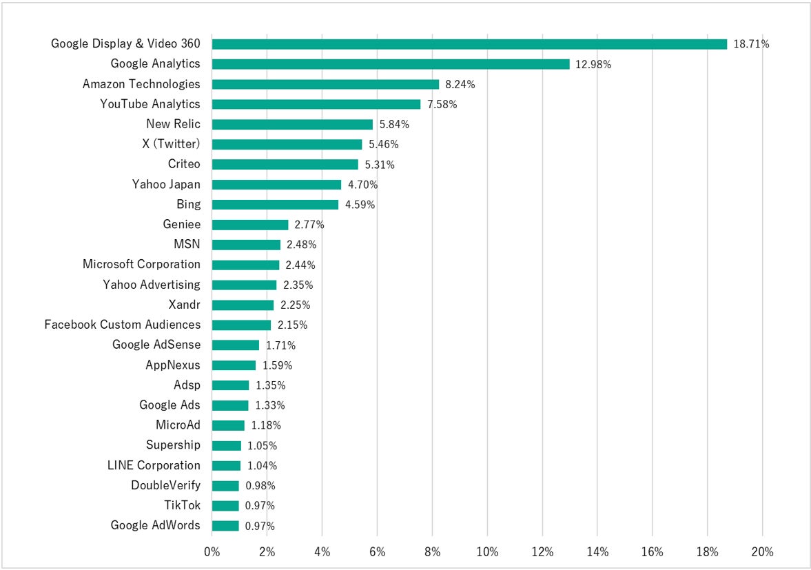 トラッキングサービスを実施しているグローバル企業に加え、日本には国内でのみ人気のあるウェブトラッカーが存在します。Yahoo! Japan ウェブポータルは広く利用されており、そのトラッカーは8位で4.70%を占めています。また、Yahooのデジタル広告Yahoo Advertising は13位で2.35%です。