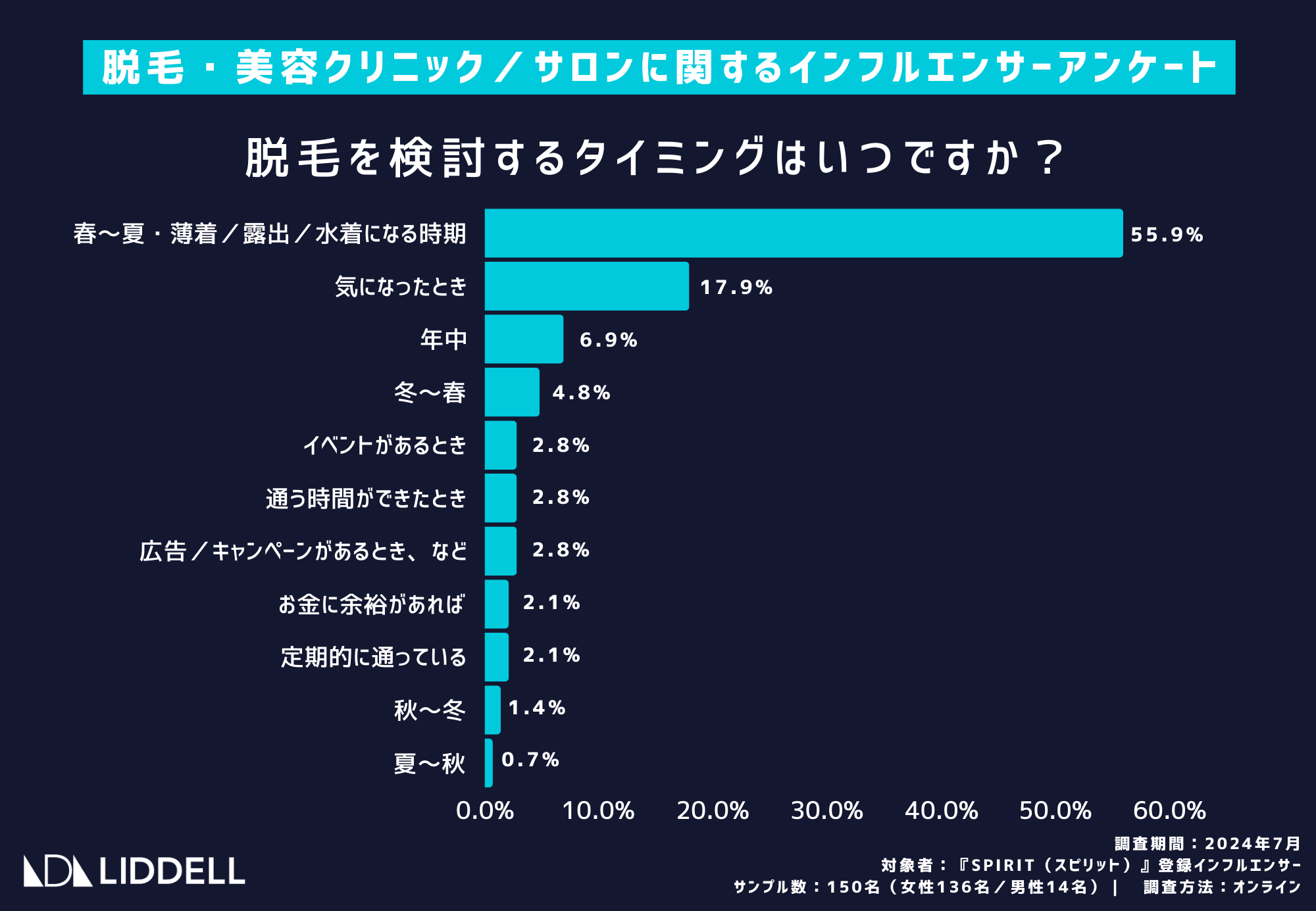 「脱毛を検討するタイミングはいつですか?」という質問に対する回答では、55.9%の回答者が「春~夏・薄着/露出/水着になる時期」に検討していることが分かりました。