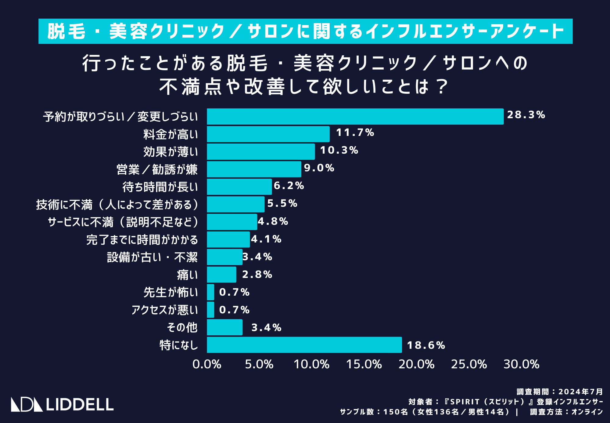 「行ったことがある脱毛・美容クリニック/サロンへの不満点や改善して欲しいことは何ですか?」という質問に対しては、「予約が取りづらい/変更しづらい」(28.3%)が最も多く挙げられました。続いて「料金が高い」(11.7%)、「効果が薄い」(10.3%)などが不満点として挙げられています。
