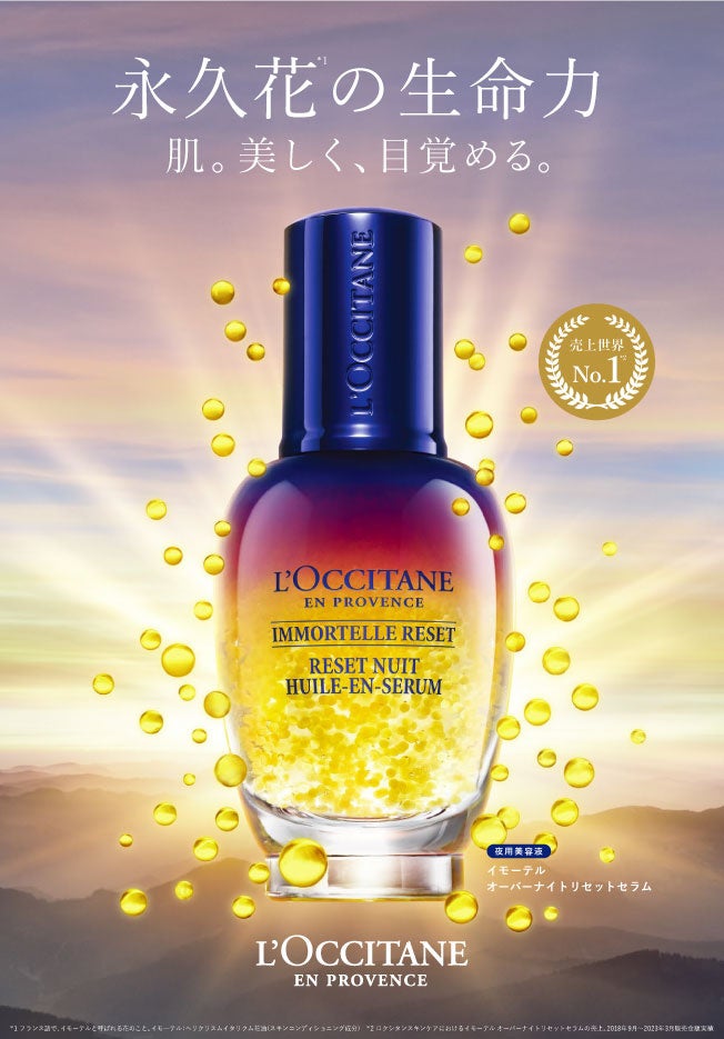 ロクシタン イモーテル オーバーナイトリセットセラムは、肌のストレスサイクルに着目し誕生したブランドを代表する夜用美容液です。ベストコスメ、シリーズ計52冠*1受賞を受賞しているこの製品は、“永久花*2=枯れない花”とも言われる南仏コルシカ島に咲く「イモーテル」の花から抽出したオイルをはじめとする植物由来の成分が肌のストレスの表面化と蓄積にアプローチ寝不足や忙しい日々が続いても、寝ている間に肌ストレスをリセットし健やかな肌へ導いてくれます。