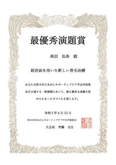 第8回日本がんサポーティブケア学会学術集会会長推薦講演にて ”最優秀演題賞” 受賞『超音波を用いた新しい発毛治療』の最新研究成果を発表