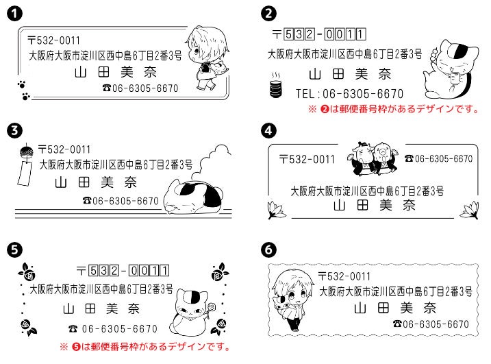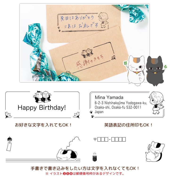 ニャンコ先生はもちろん、ニャンコ先生の本来の姿である斑(まだら)や物語の主人公である夏目貴志、そして中級妖怪や子狐、黒ニャンコといった妖怪たちが枠を飾る、押すたびにほっこり癒してくれる住所印です。