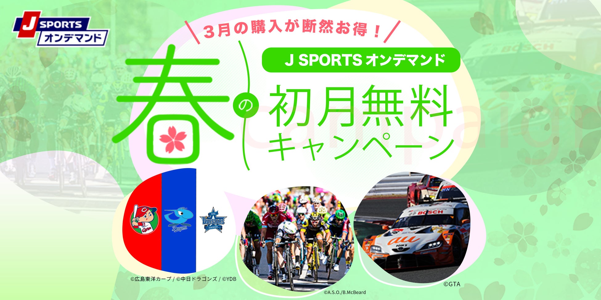 このキャンペーンは、3月1日(火) から3月31日(木)の期間内にJ SPORTSオンデマンドの「野球パック」、「サイクルロードレースパック」 、「モータースポーツパック」のいずれかをご購入された方を対象に、1か月分の料金で4月30日(土)までご視聴いただける大変お得な内容となっております。レギュラーシーズン開幕を迎えるプロ野球、欧州のロードレースが本格開幕を迎え、注目レース盛りだくさんのサイクルロードレース、SUPER GTをはじめ国内外の各レースが開幕するモータースポーツを当キャンペーンにて存分にお楽しみ下さい。