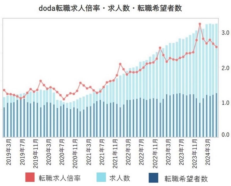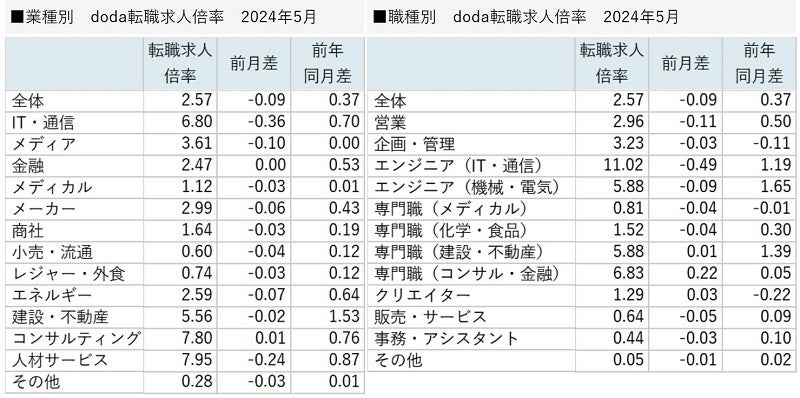 doda転職求人倍率2024年5月は2.57倍(前月差‐0.09ポイント)