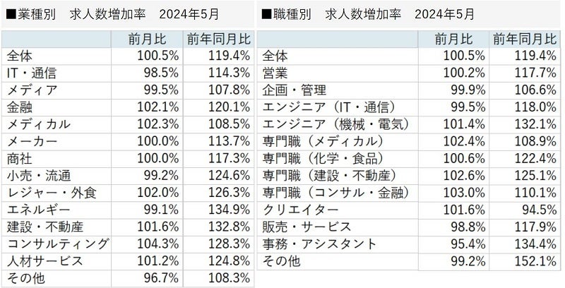 求人数は、業種別では12業種(「その他」は除外)のうち6業種で前月から増加しました。最も増加率が大きかったのは「コンサルティング」(前月比104.3%)、次いで「メディカル」(前月比102.3%)でした。職種別では11職種(「その他」は除外)のうち7職種で前月から増加しました。最も増加率が大きかったのは「専門職(コンサル・金融)」(前月比103.0%)、次いで「専門職(建設・不動産)」(前月比102.6%)でした。
