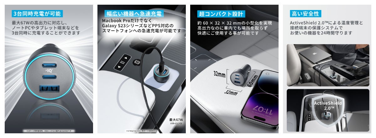 Ankerのカーチャージャー史上最高出力&3ポート搭載し、移動中の車内でもノートPCとタブレット端末、スマートフォンを3台同時に充電が可能な一台。USB-Cポートは最大67W出力で、MacBook Proにも充電できる他、発熱を抑えながら接続機器に合わせて効率的に充電するProgramable Power Supply(以下PPS)に対応しているため、Galaxy S23シリーズにも急速充電が可能です。またUSB-Aポートは最大22.5W出力のため、同時にiPhoneも充電ができます。幅広い機器に合わせて最適な充電を行うPowerIQ 3.0(Gen2)や温度管理や過充電防止等の多重保護システムに加え、充電時の温度上昇を監視し、充電器本体が規定の温度に達した場合は、電流 / 電圧の負荷度合いを調節することで、過度の温度上昇を未然に防ぐ「ActiveShield™️ 2.0」も搭載しています。