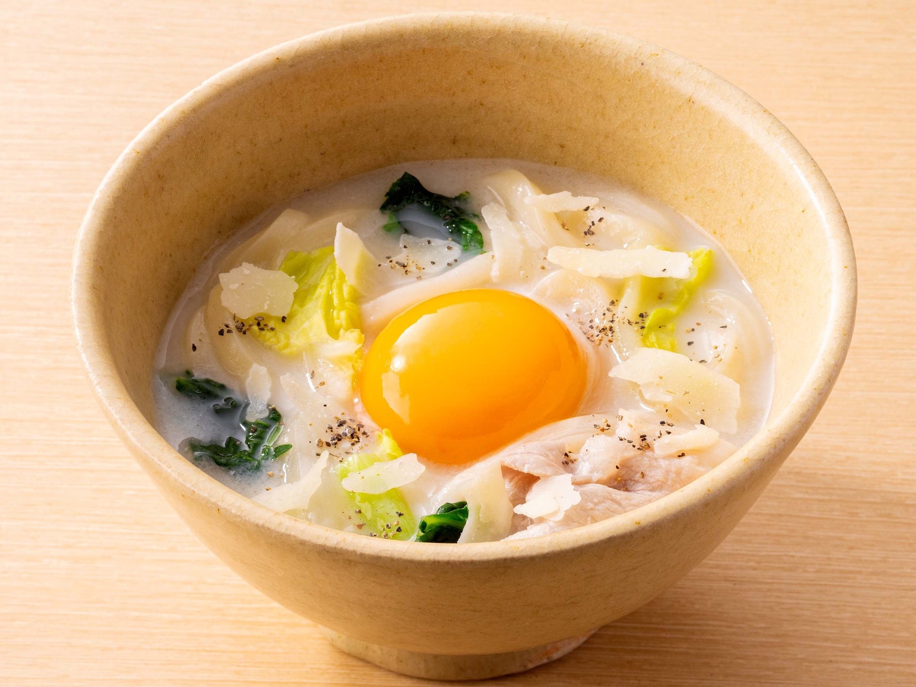 パルメザンチーズ+卵黄+黒胡椒+うどん。クリーミーな美味しさがやみつきになります。
