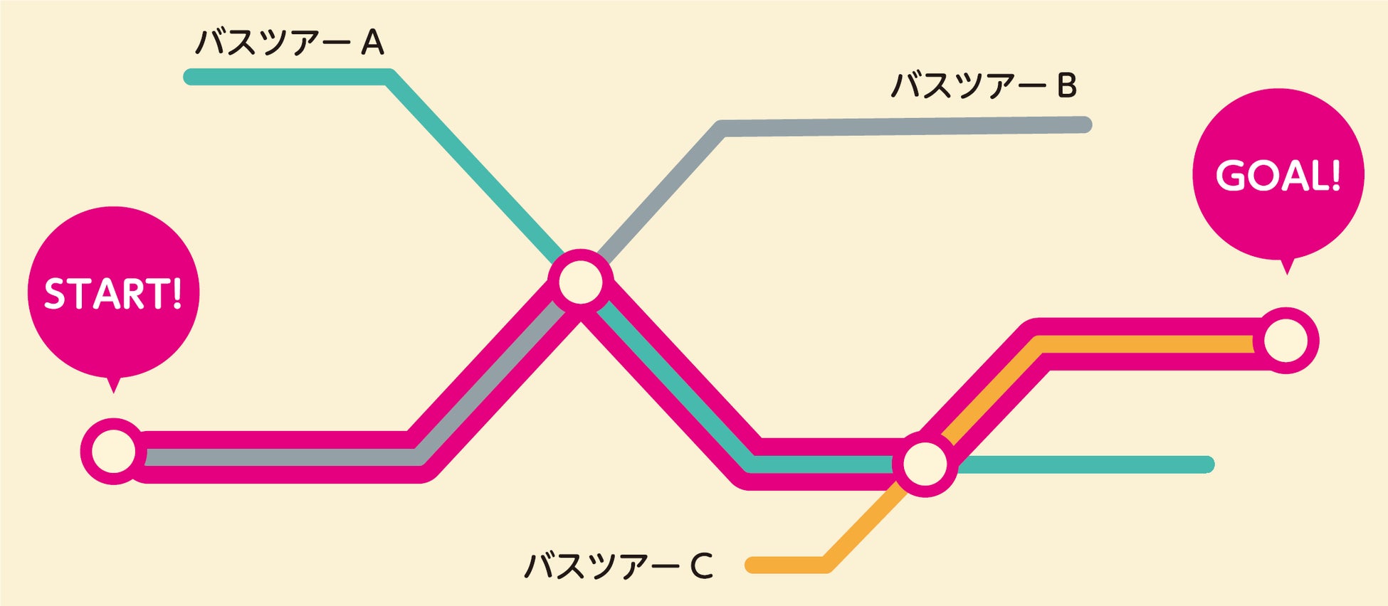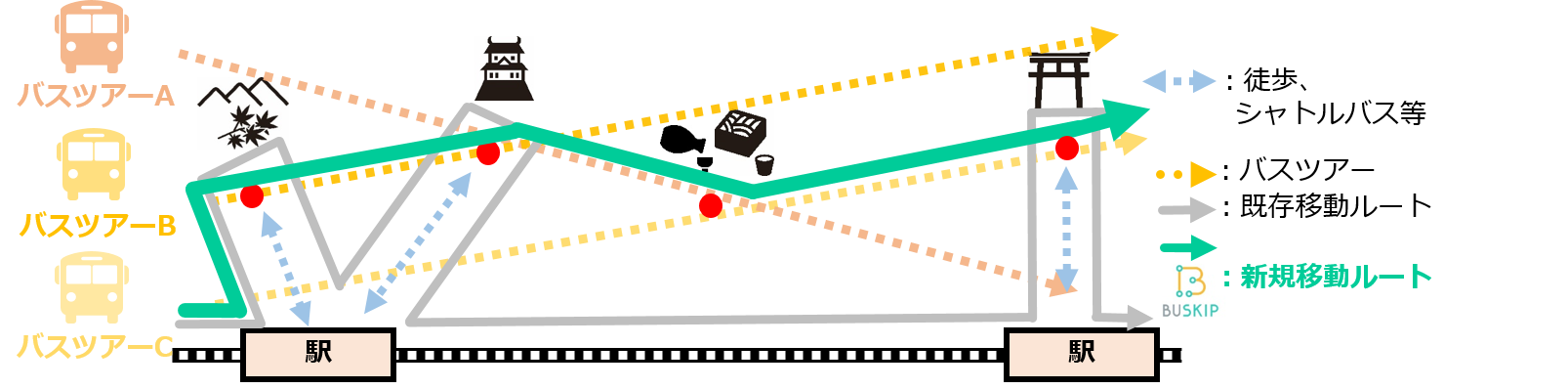 旅行をする際、訪問に車を必要とする観光スポットも多くあり、特に個人旅行をする際のハードルとなっています。BUSKIPでは、さまざまな旅行会社が提供する既存のバスツアーをお客さまに部分的に選んで乗っていただくことで、観光スポットと観光スポットをダイレクトに巡ることや、車以外にアクセス手段がない観光スポットを訪れることを可能にします。これにより、車の運転が難しい方などもより満足度の高い快適な旅をお楽しみいただけるようになります。