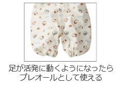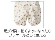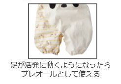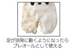 新生児の頃はおむつ替えがしやすいドレスとして、足の動きが活発になってきたらプレオールとして着用すれば裾がまくれ上がりません。