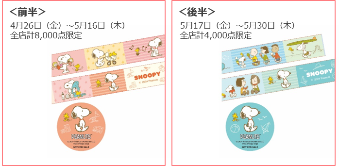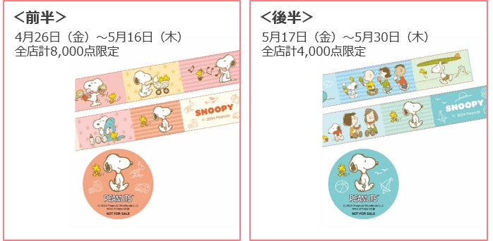 4月26日(金)から5月30日(木)期間中、下記のマークがついている対象商品を含む2,200円(税込)以上ご購入いただいた方に、スヌーピー「マスキングテープ」をプレゼントいたします。