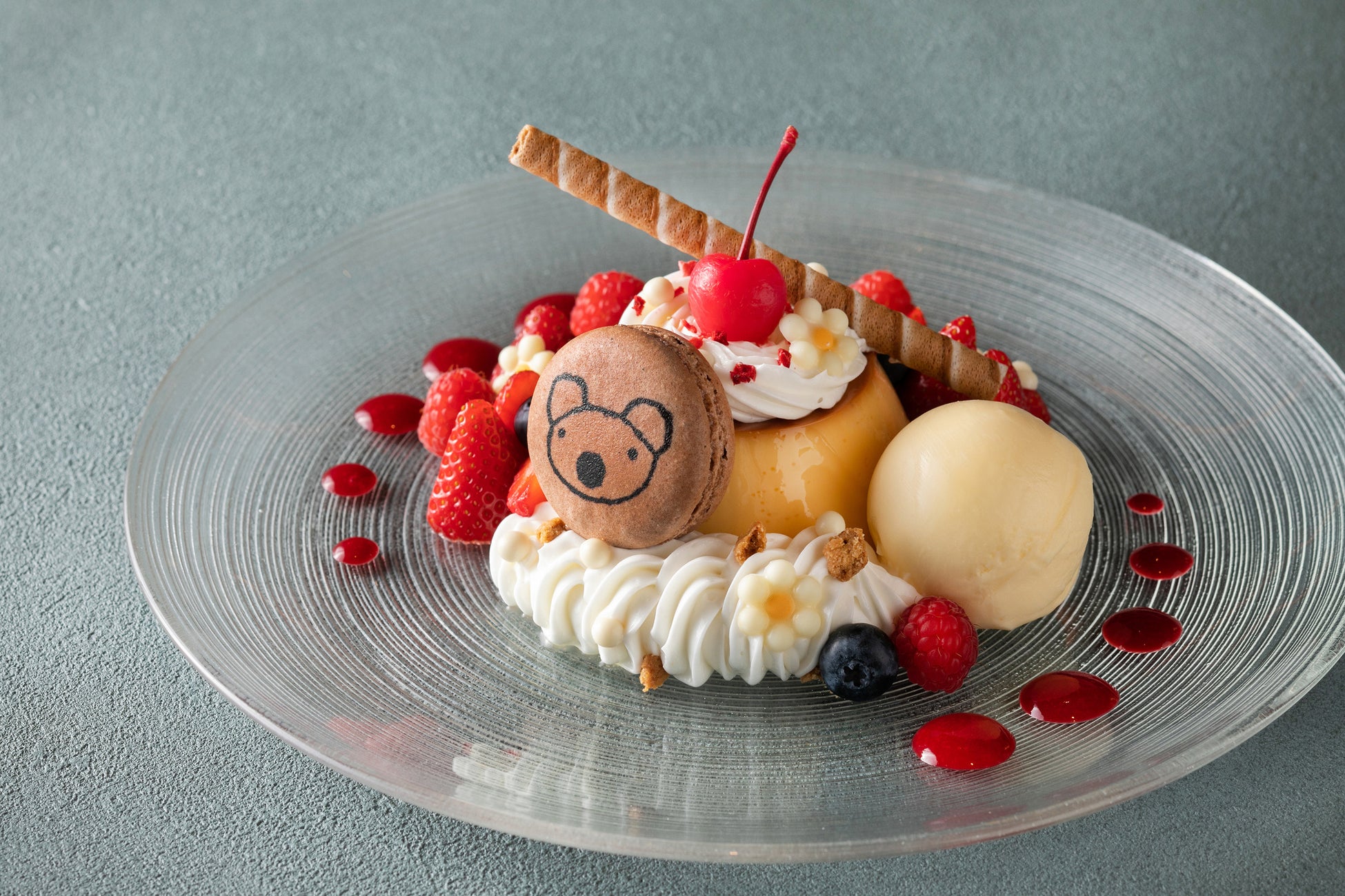 ペネロペがプリントされたフランスの名菓マカロンを添えた、見た目も可愛らしいプリンアラモード