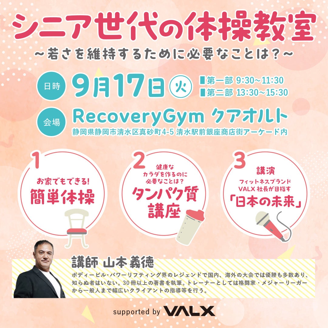 そこで、今回初のシニア向けイベントとして講師を務めるトレーニング界のレジェンド山本義徳氏の地元静岡県にて、通所介護施設RecoveryGymクアオルトと共同で体操教室を開催する運びとなりました。