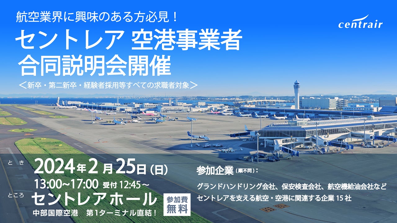 中部国際空港セントレア(以下セントレア)では、各種ハンドリング、保安検査、警備などを担う空港内事業者 計15社による「空港事業者合同説明会」を2024年2月25日(日)13時から開催します!