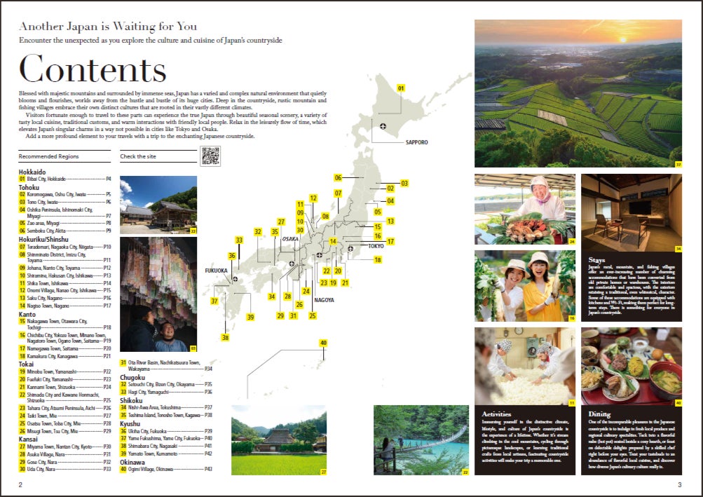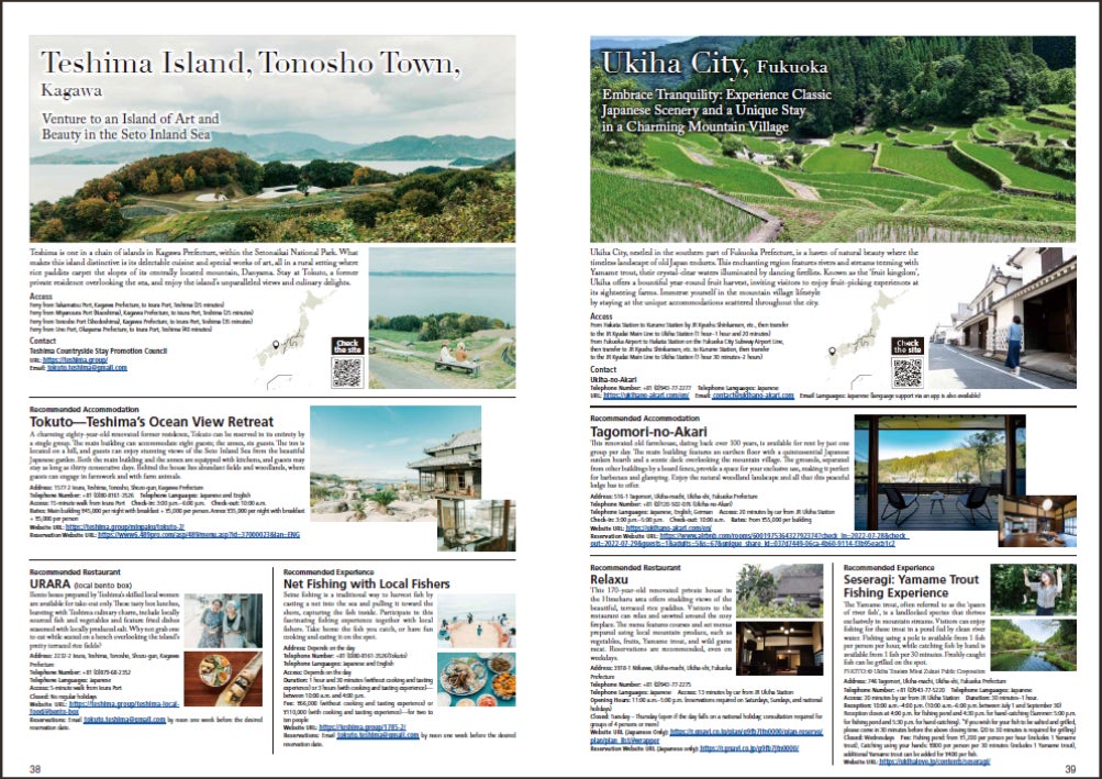 伝統的な古民家をリノベーションした宿や、地域の風土に根差した食事が楽しめるレストラン、職人たちが長きにわたって受け継いできた工芸品づくりが体験できる場所、大自然を満喫できるトレッキングなどのアクティビティが楽しめる場所など……。日本の農山漁村の多彩な魅力を紹介しています。