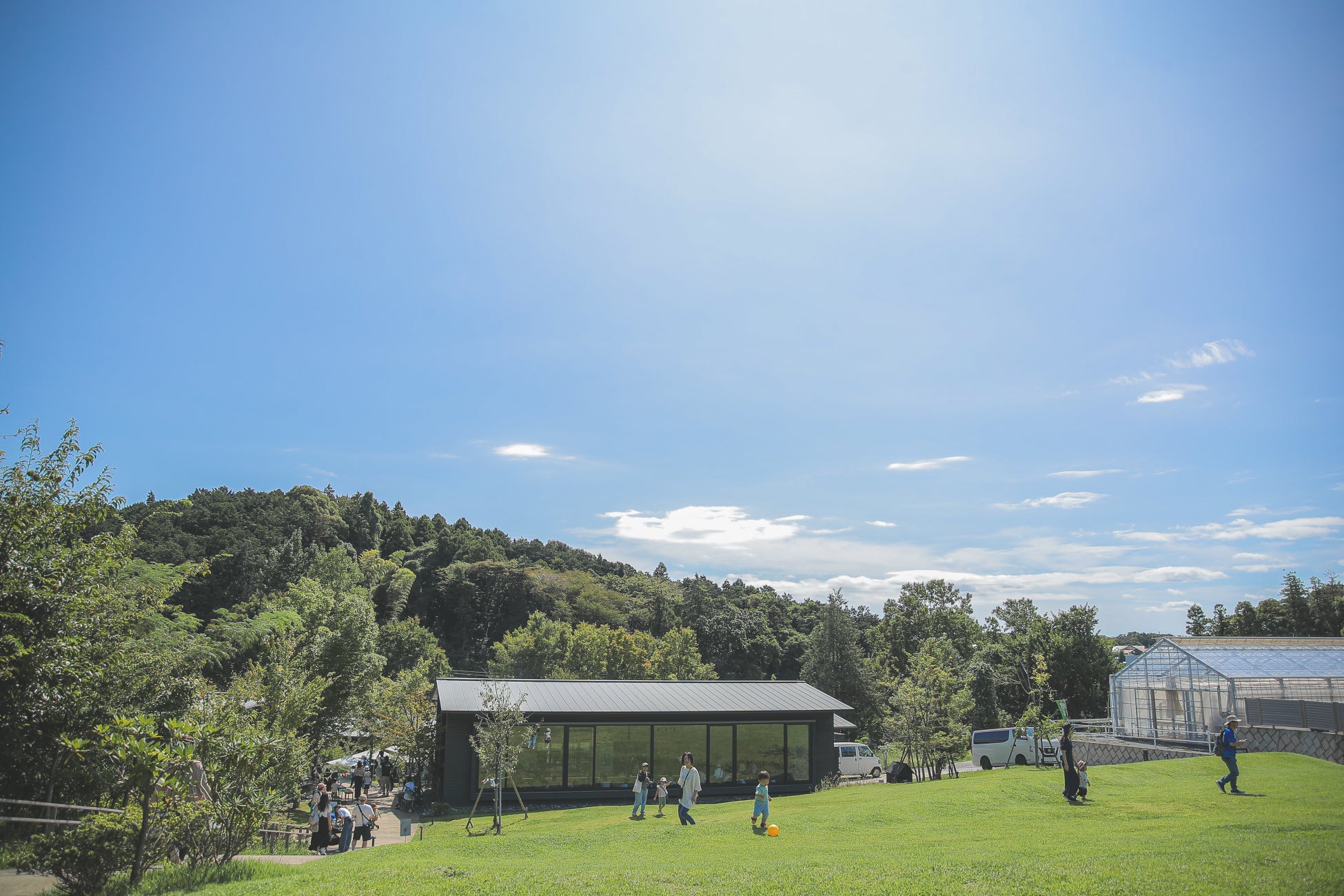 芝生広場に面した大きな窓から広がる景観はまるで海外にトリップしたかのよう。人気の「薬師ソフトクリーム」や地場食材を使ったメニュー、さらに公園内の好きな場所へ持ち出せる「ピクニックバスケット」もご用意。イベントとともにぜひご利用ください。