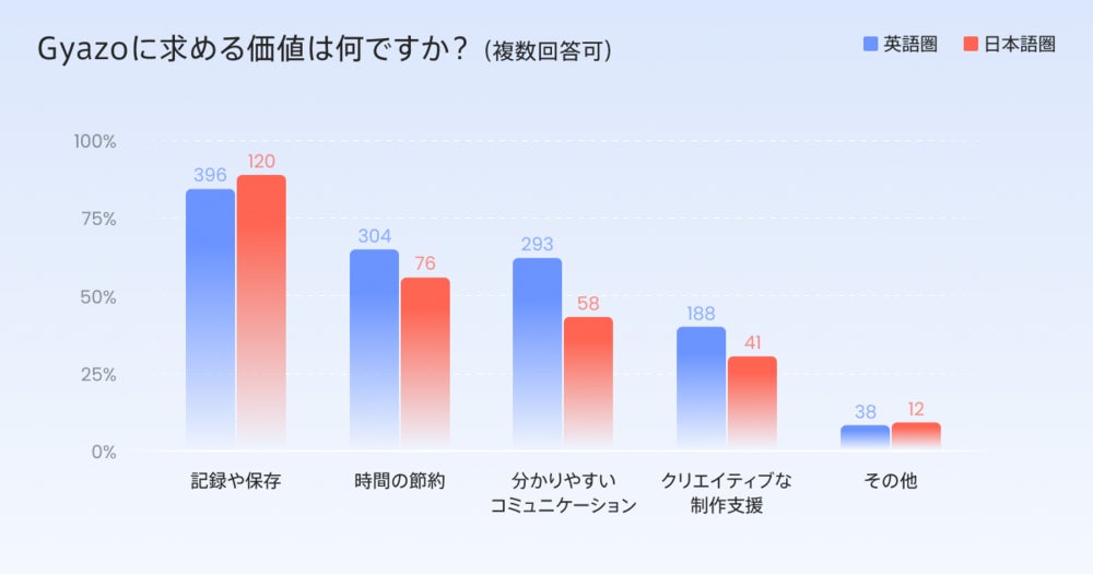 「Gyazoに求める価値」を尋ねたところ、最も多かった回答は「記録・保存」(英語圏85%、日本語圏89%)でした。「時間の節約」や「伝達の容易さ」を大きく上回り、スクリーンショットが“その場の共有”だけではなく、“後から必要な情報を取り出すための記録”として活用されていることがわかります。