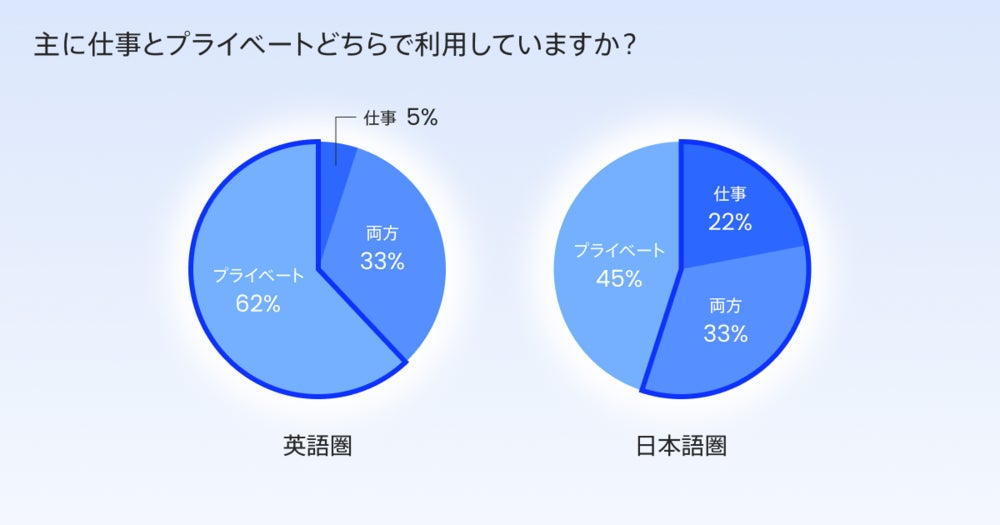 アンケート結果から、 画像の利用目的は国・地域によって明確に二極化していることが明らかになりました。英語圏では「プライベート利用のみ」が62%を占め、主にゲームなどの趣味や日常の記録といった用途が主流です。一方で、日本語圏では「仕事利用のみ」と「仕事との併用」を合わせた業務に関連する利用が55%となり、英語圏(33%)よりも業務領域での活用が進んでいます。