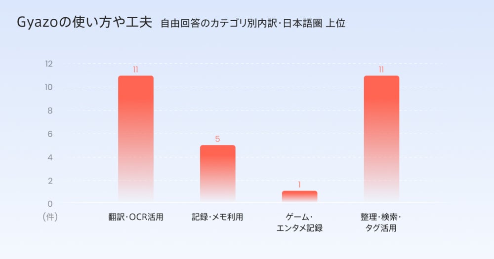 さらに、保存した画像をOCR(画像内テキストの自動認識)によってテキスト化し、AIや翻訳ツールへ入力する活用例も多く見られました。具体的には、映像の切り抜き、セミナーの投影スライド、手書きノート、海外ゲームの画面など、多様な画像から自動抽出されたテキストを用いて、ChatGPTやDeepLで要約・情報整理・翻訳を行うケースが挙がっています。特に日本語圏では、「翻訳・OCR活用」が「整理・検索」と並んで最も多い回答群となっており、画像がAI活用の起点として利用されている実態が浮かび上がりました。