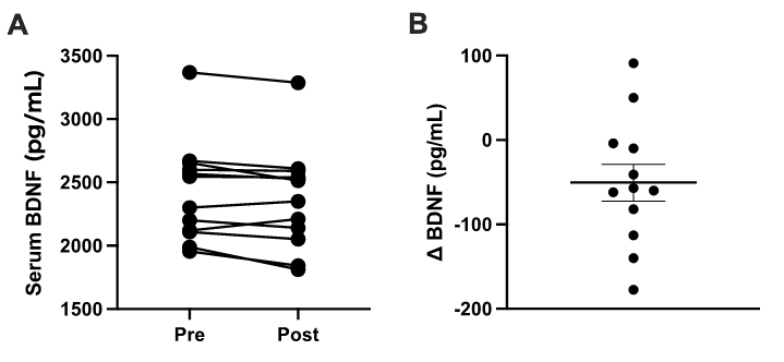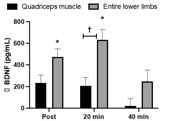 図3:血中BDNF濃度の変化量(Preとの差分)*p<0.05,Preとの比較.† p<0.05,条件間の比較