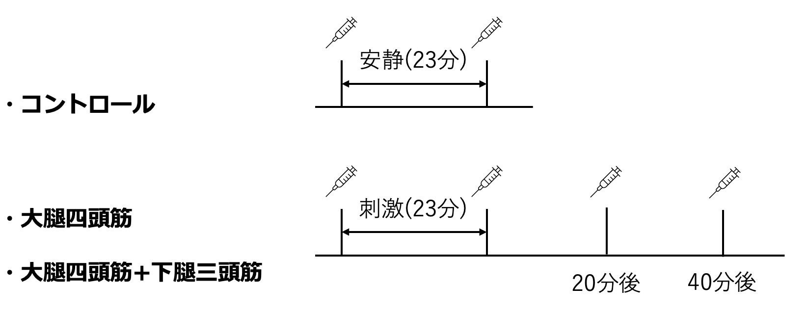 本研究では,健常若年者12名(男性9名,女性3名,27.3±5.5歳)を対象とし,2条件のEMS介入およびコントロール(無刺激)の合計3条件を実施しました(図1)。採血は,Pre,Post,20min,40minのそれぞれで実施しました。コントロール条件のみ,PreとPostのみ採血を行いました。EMSは座位姿勢にて23分間実施しました。介入効果が反映されないよう,各条件間で最低1週間の間隔を空けて実施しました。