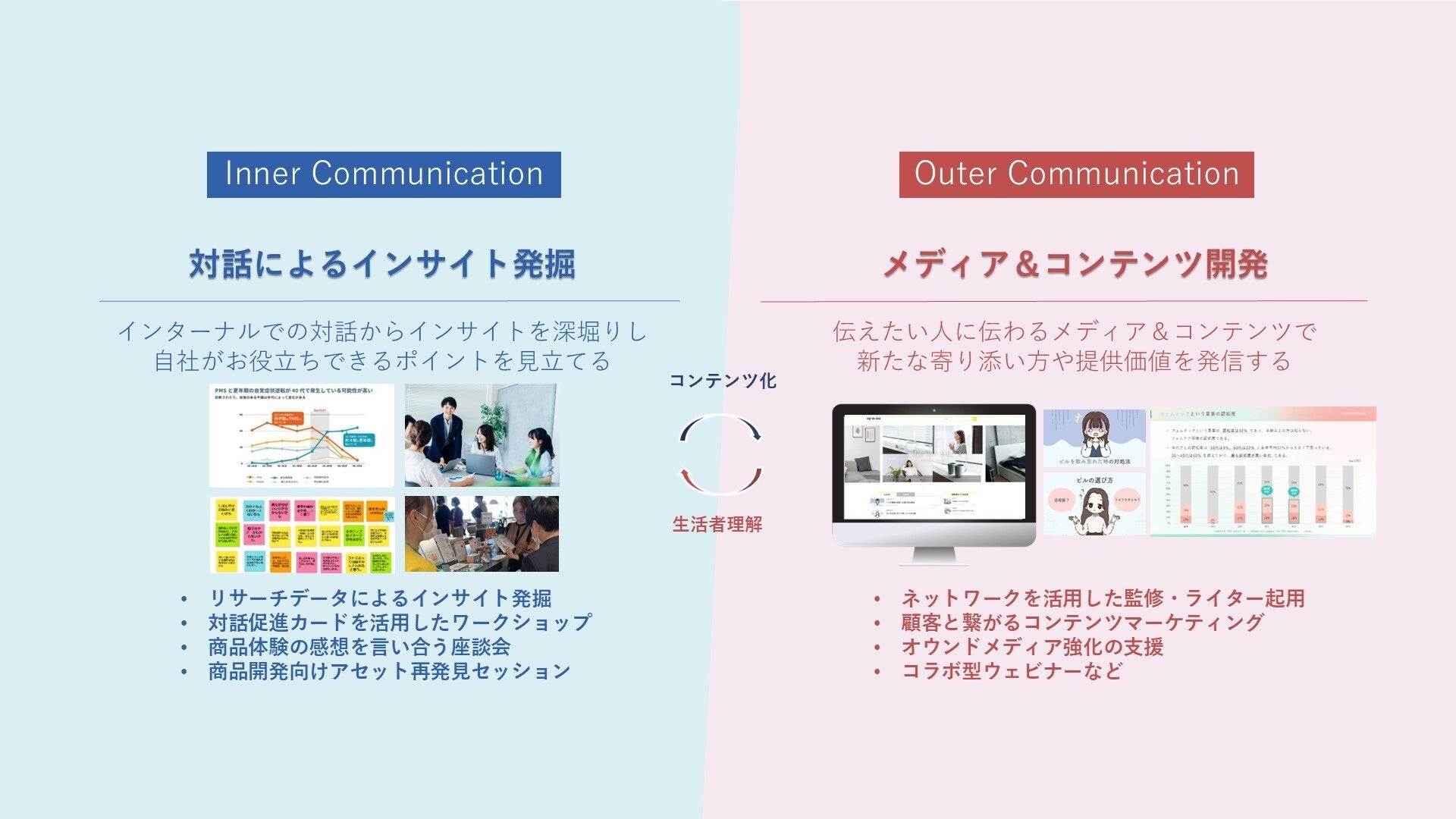 私たちは、女性が多様な情報・サービス・製品を知り、本当の意味で自分で「選択」できる社会の実現を目指して活動するチームです。2023年より、強みの一つである専門家ネットワークを最大限に活用し、コンテンツマーケティング支援を行ってきました。市場のインサイト分析をもとに、企業のブランド価値向上や健康経営推進を支援するコンテンツの企画・制作・発信を通じ、企業と生活者をつなぐ役割を果たしています。女性がより多くの選択肢を持ち、自分で選択できる社会を実現するためには、情報の非対称性を解消することが不可欠だと考えています。