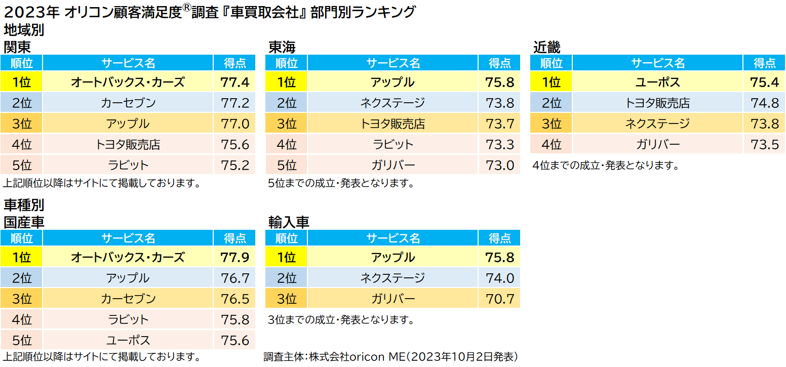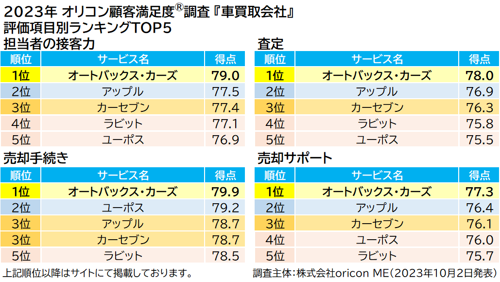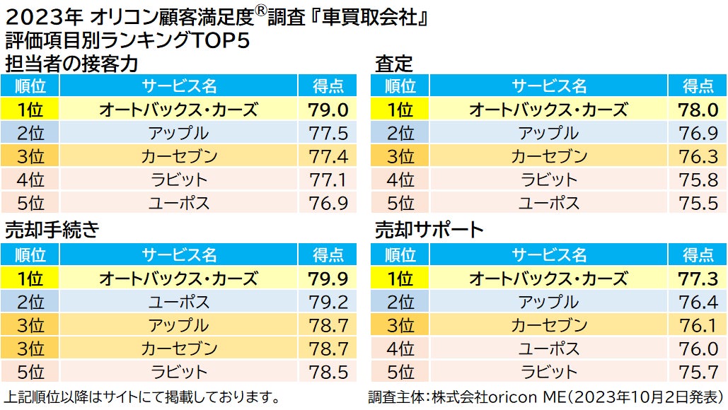 2023年 満足度の高い『車買取会社』ランキング |【オートバックス・カーズ】が3年連続総合1位獲得、初の全評価項目1位に 評価項目別「担当者の接客力」では5年連続の1位に(オリコン顧客満足度調査)