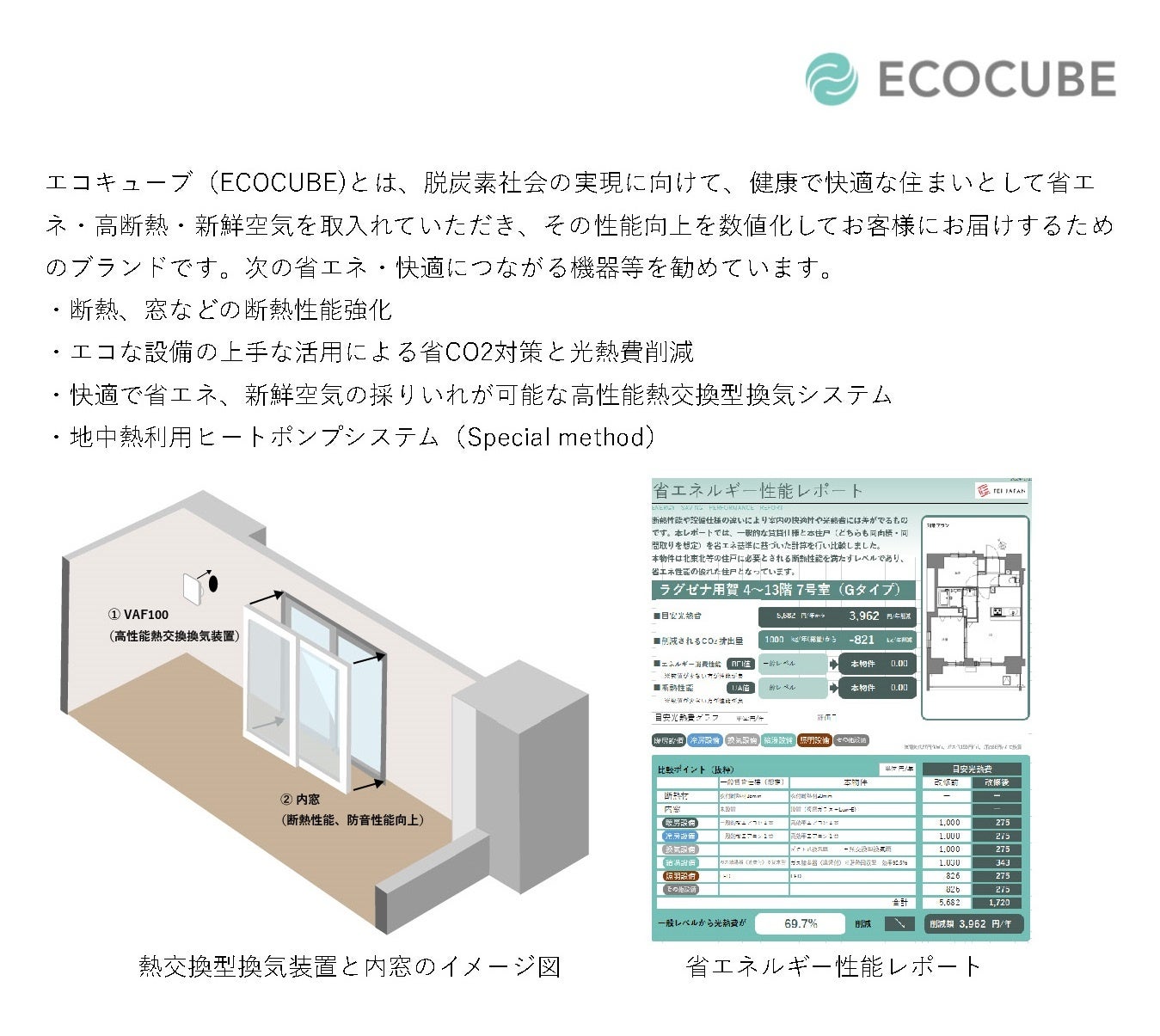 「LUXENA用賀」では、住まいの省エネ化・高断熱化及び性能の見える化などの取組みを行っている株式会社リコシス様の省エネブランド「エコキューブ」を採用しています。断熱性の高いインナーサッシ・高効率エアコン・熱交換型換気扇などの導入により、室内環境と光熱費の削減などの省エネ向上を図りました。また、共用部の冷暖房設備には「地中熱ヒートポンプシステム」を導入し、温室効果ガスの排出量の削減に寄与しています。