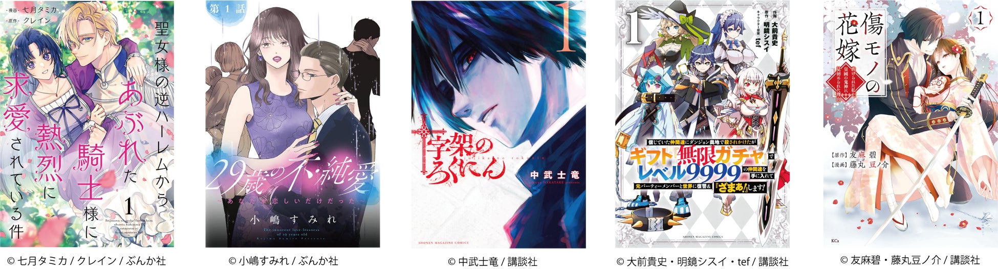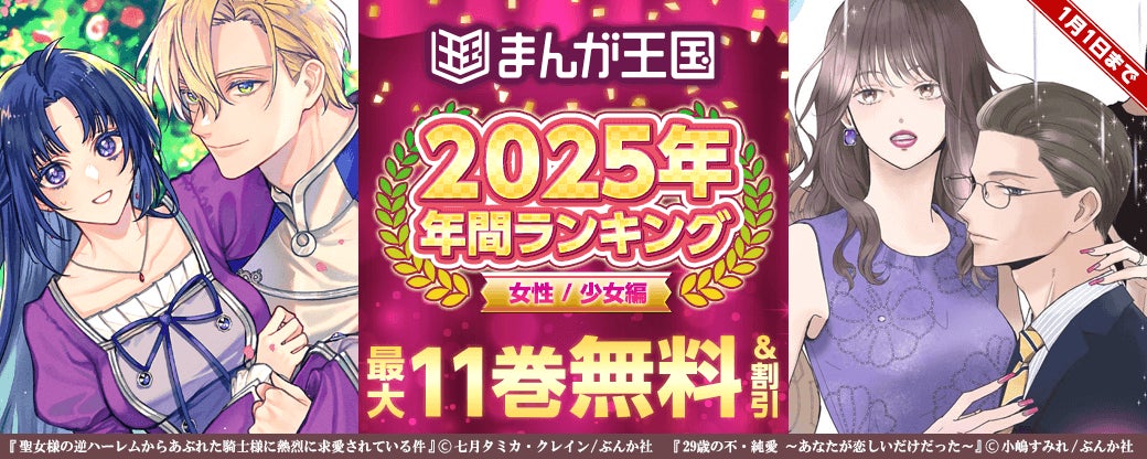 2025年『まんが王国』年間ランキングでは、『まんが王国』内で販売された電子書籍の売上実績を独自に集計し、「総合」「女性」「少女」「青年」「少年」などカテゴリー別で公開しております。総合ランキングでは、当社グループ会社であるぶんか社の「聖女様の逆ハーレムからあぶれた騎士様に熱烈に求愛されている件(分冊版)」と「29歳の不・純愛 ~あなたが恋しいだけだった~(分冊版)」がそれぞれ1位・2位を獲得いたしました。特設ページでは、各カテゴリーTOP100を紹介しておりますので、ぜひ合わせてご覧ください。