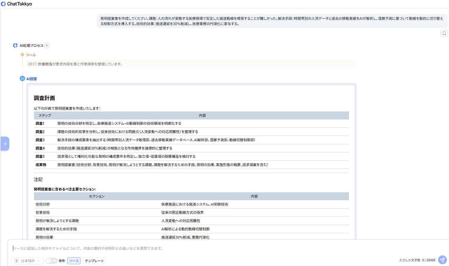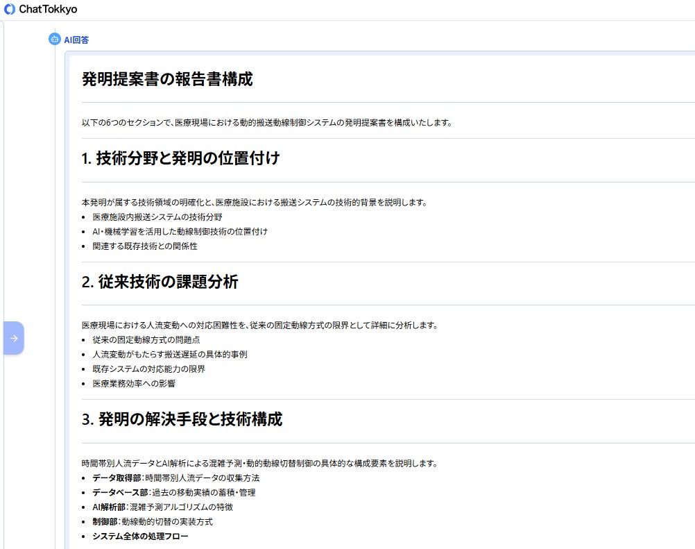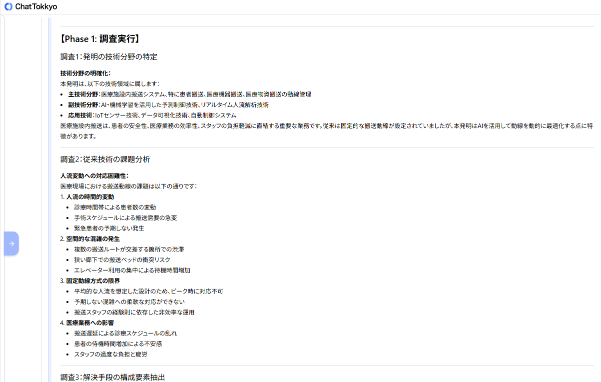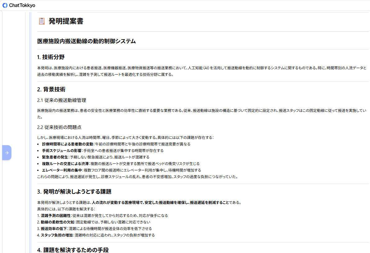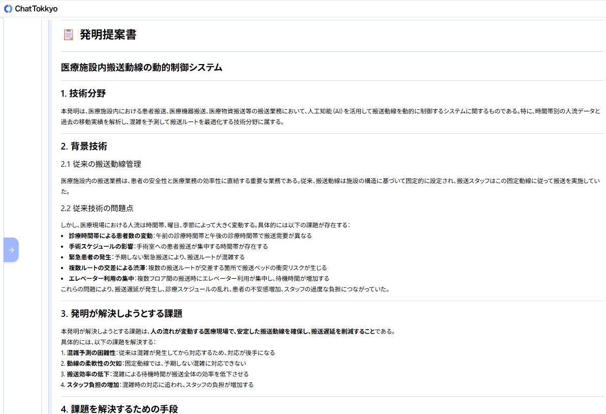 MyTokkyo.Aiは、病院内の搬送フローや制御ロジックに関する資料を入力することで、AIが内容を解析し、「課題」「解決手段」「技術的効果」という特許検討に必要な観点から発明要素を自動的に整理できる。また、医療施設向けロボットや動線制御に関する先行技術を参照しながら検討を進められる点も評価された。