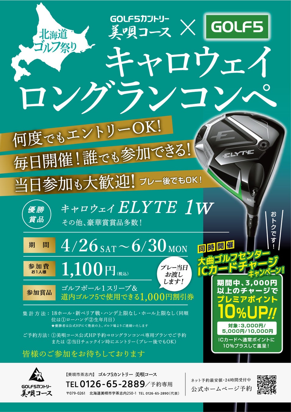 4月26日(土)〜6月30日(月)の期間中、ゴルフ5カントリー美唄コースにて「キャロウェイロングランコンペ」を開催いたします。優勝者にはキャロウェイのELYTEドライバーをはじめとする、豪華賞品を多数ご用意。コンペは毎日開催し、当日参加も可能です。