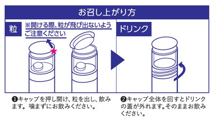 粒とドリンクを一体型の容器におさめた、1日1本と1粒(目安)に手軽に続けやすい形状です。