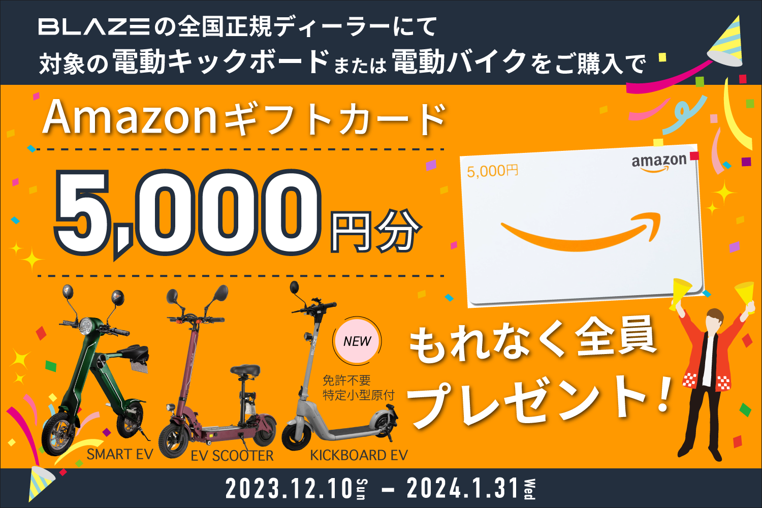 ブレイズの提唱する新ブランドコンセプト「LIFE EV」(*下記参照)の下に展開する電動キックボードまたは電動バイクを、全国の正規ディーラーにてご購入のお客様に、Amazonギフトカード5,000円分をもれなくプレゼントいたします。