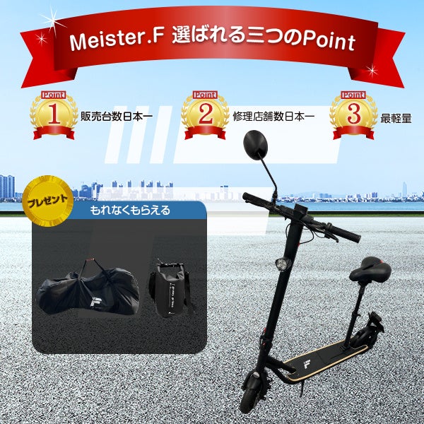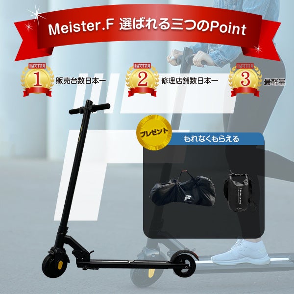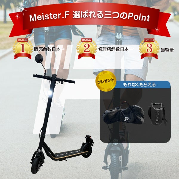 また、電動キックボードをご購入で合計7,000円相当の持ち運びや収納に便利な輪行バッグとMEISTER.Fオリジナル防水バッグをプレゼントします。