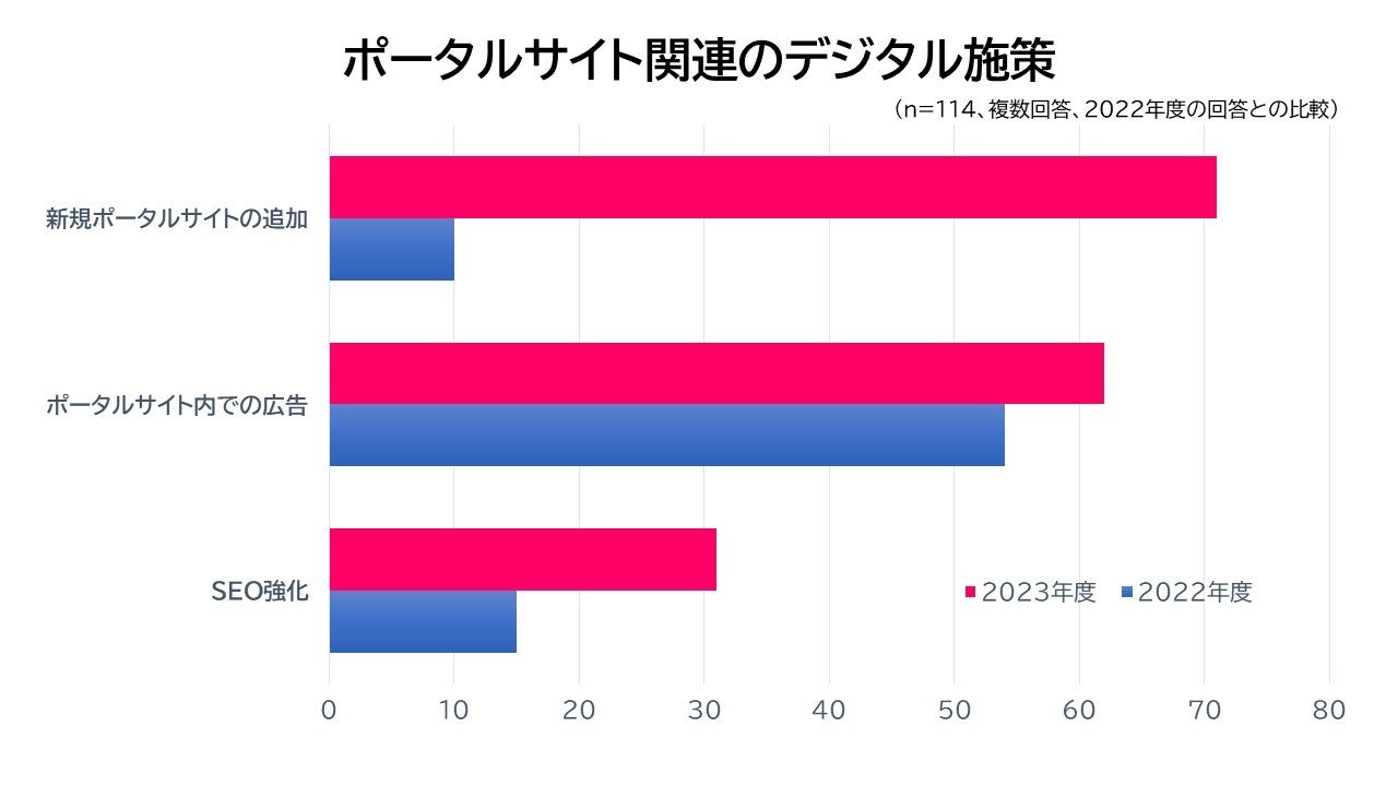 2023年度に行った認知活動で最も多かったのは、ポータルサイト関連のデジタル施策で、この取り組みを選んだ回答が前年対比256%となりました。
