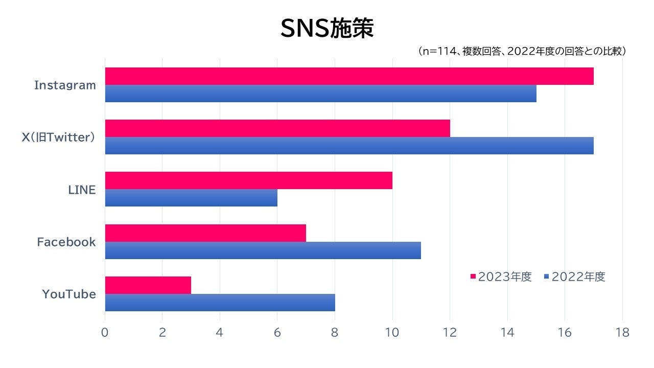 対して拡大したのは、前年度にも多くの自治体が取り組んでいたInstagram(約115%)に加え、2023年度は特にLINE(約170%)の活用でした。