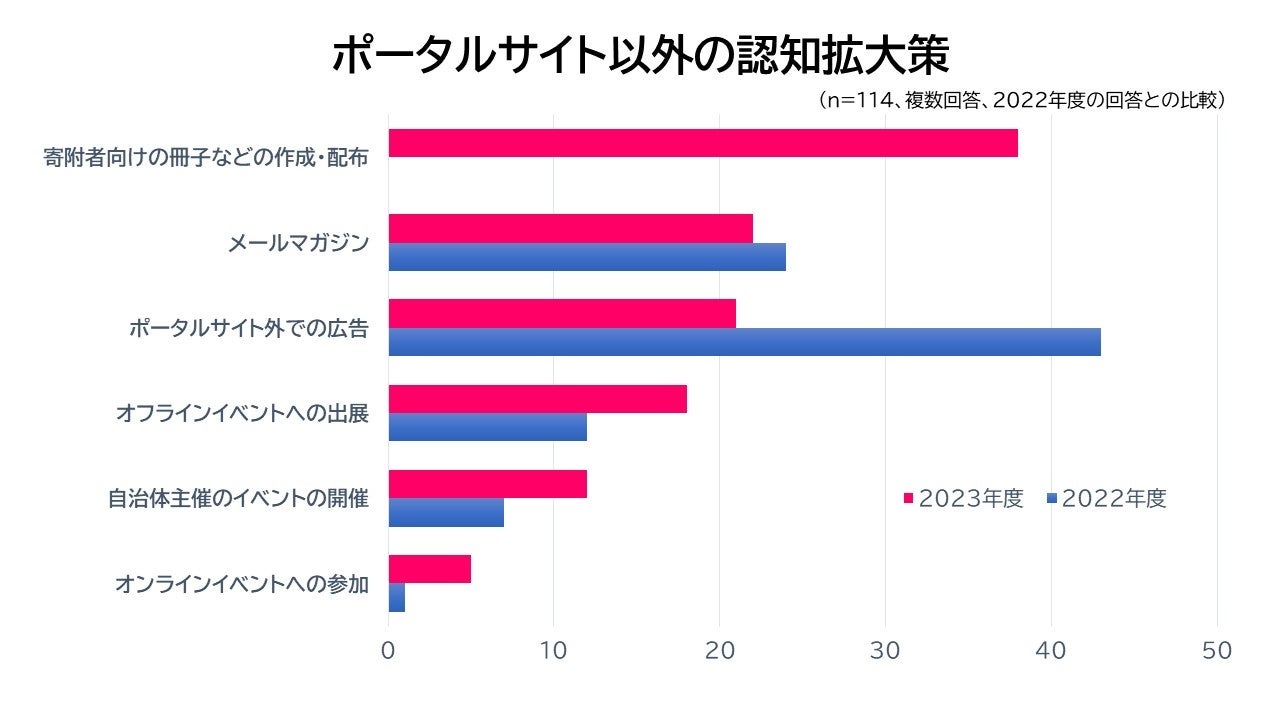 また、寄附未経験者、つまり潜在寄附者への認知活動としては、「オフラインイベントへの出展」や「自治体主催のイベントの開催」など、寄附者と直接対面の場で自治体や特産品などをアピールすることに積極的に取り組んだ自治体が2022年度に比べて約160%と大きく拡大しました。アフターコロナでオフラインでのイベントが数多く開催され、それらのイベントを通じて寄附者との接点拡大を図った自治体が増えたようです。