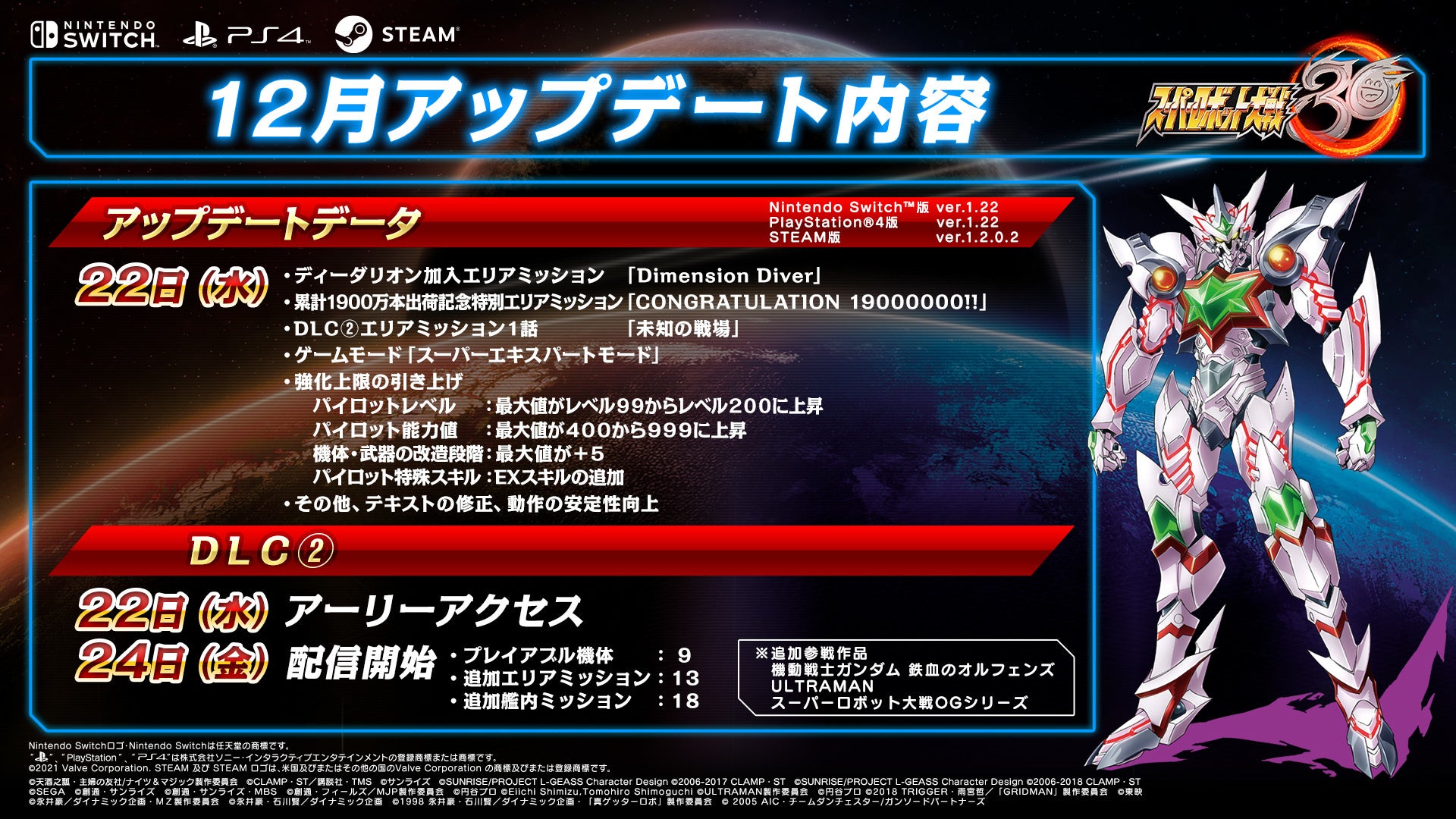 『スーパーロボット大戦30』12月22日(水)午前8時の無料アップデートにてディーダリオンが加入するエリアミッションを配信予定!DLC②は12月24日(金)午前8時に配信予定!