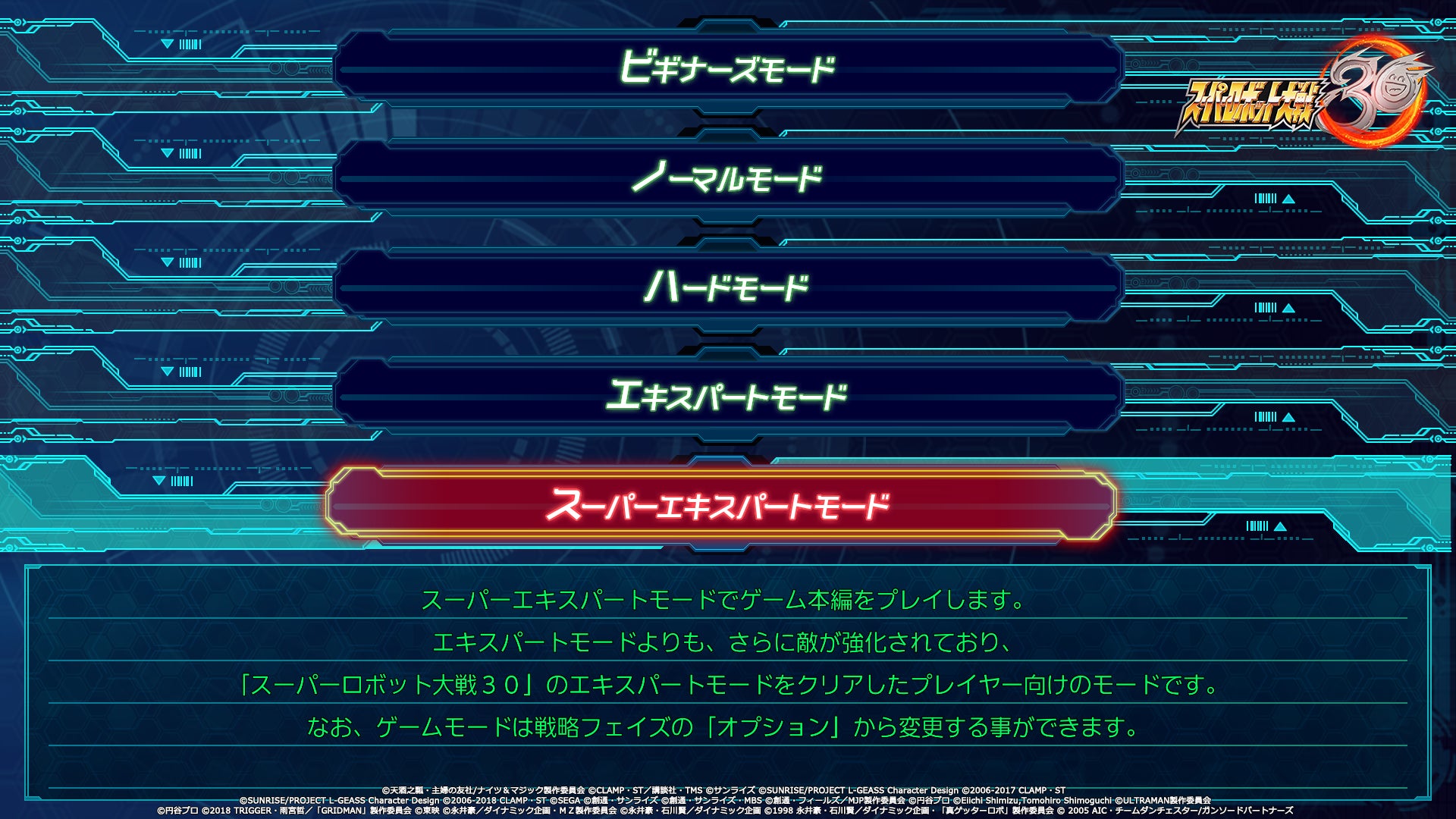 「スーパーエキスパートモード」 は「エキスパートモード」をクリアしたプレイヤー向けの高難度のゲームモードです。敵機体の改造度や敵パイロットの撃墜数などが「エキスパートモード」よりも高くなっています。そのため、序盤からエースボーナスやカスタムボーナスを獲得している敵も出現します。