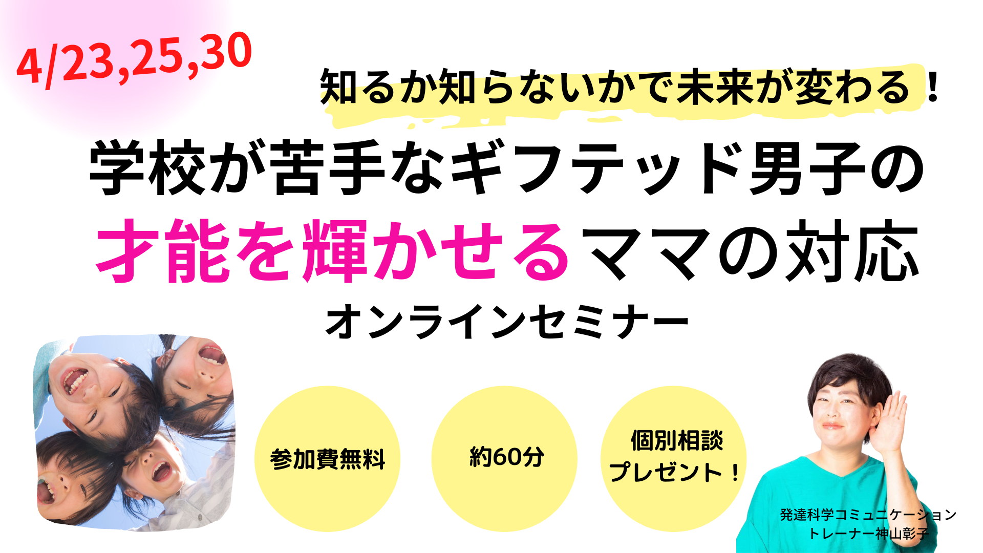 初めまして。親子のコミュニケーションをスムーズにして子どもの発達を加速する「発達科学コミュニケーション 」子育て講座講師の神山彰子と申します。この度は、学校が苦手なギフテッド男子の才能を輝かせるママの対応オンラインセミナーを開催いたします。