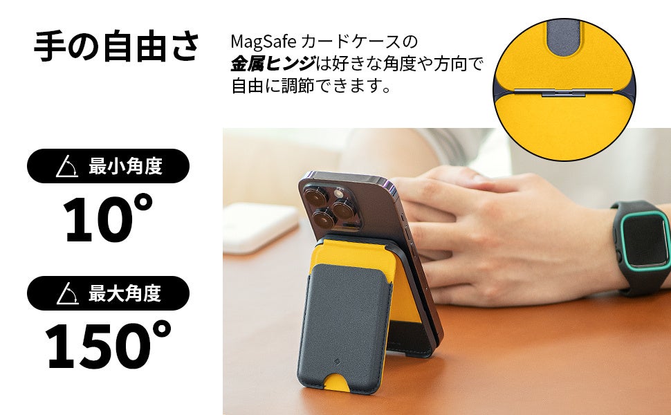 MagSafe対応カードケースにメタルヒンジを適用して10°から150°まで角度調節が自由にできます。また、カメラの干渉なく使用することができるようにデザインされており、横向きも縦向きも自由に設置して活用することができます。