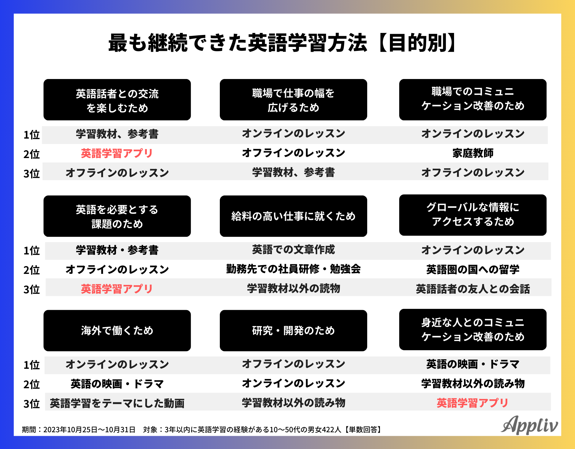 英語話者との交流を楽しむ、英語を必要とする課題、身近な人とのコミュニケーション改善を目的に英語を学習している人の中で、「アプリ」が最も継続できた学習方法のTOP3に選ばれていました。