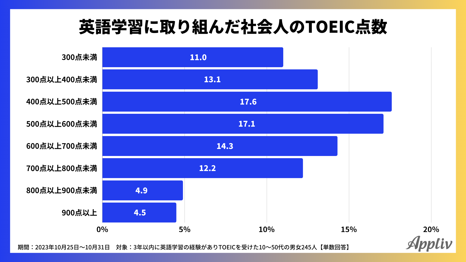続いて、英語学習に取り組む社会人のうち、TOEICを受けたことがある245人の点数を尋ねた結果がこちらです。