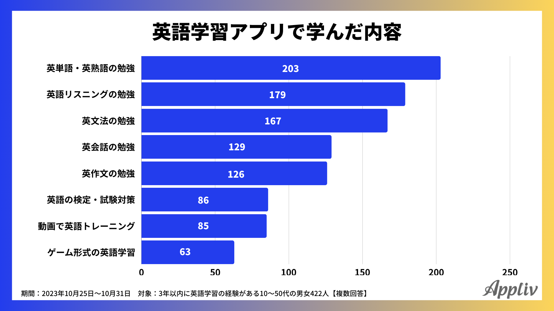 英語学習のためにアプリを活用したと回答した人に、どのような内容を学んだのかを聞いてみました。