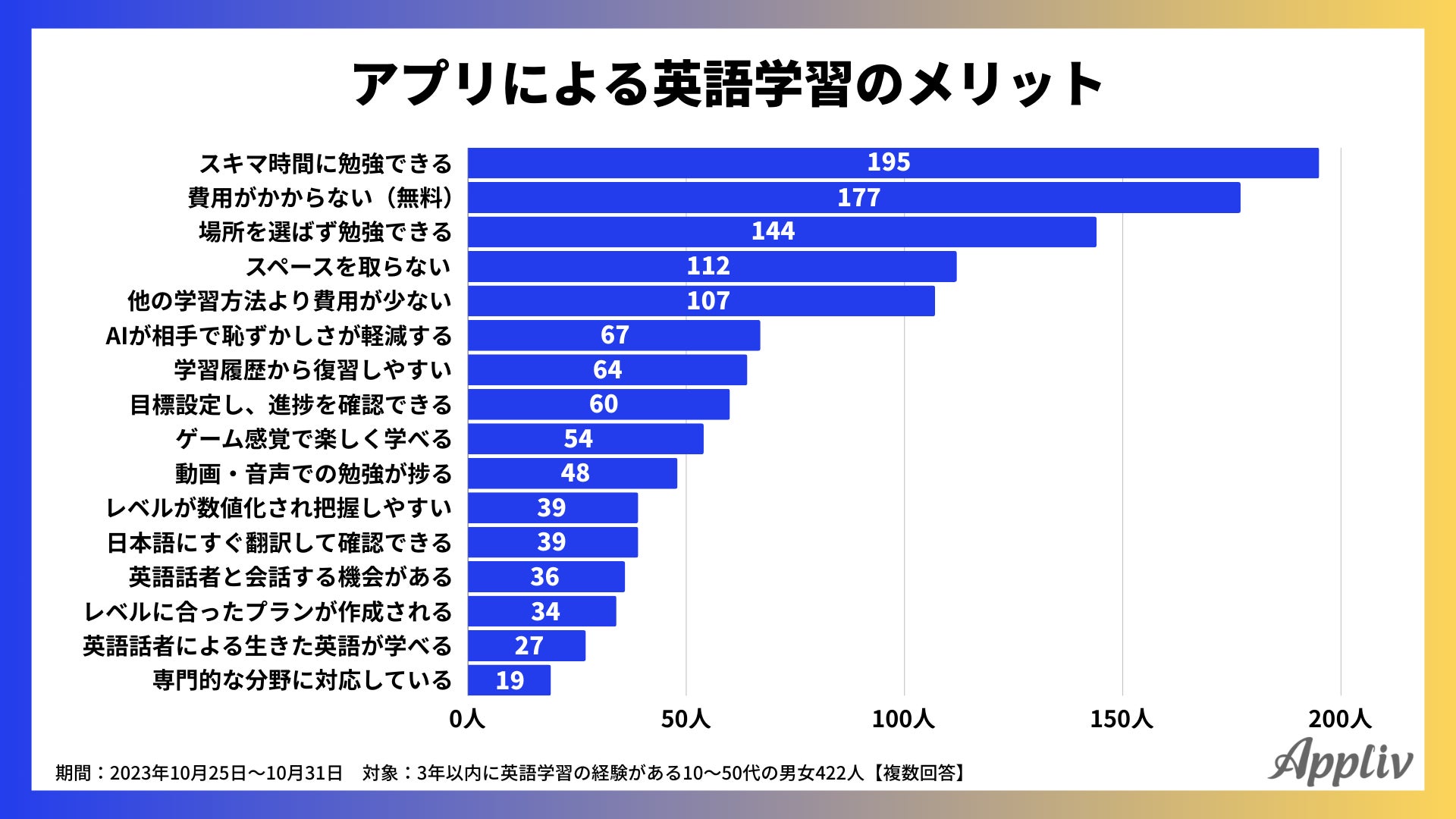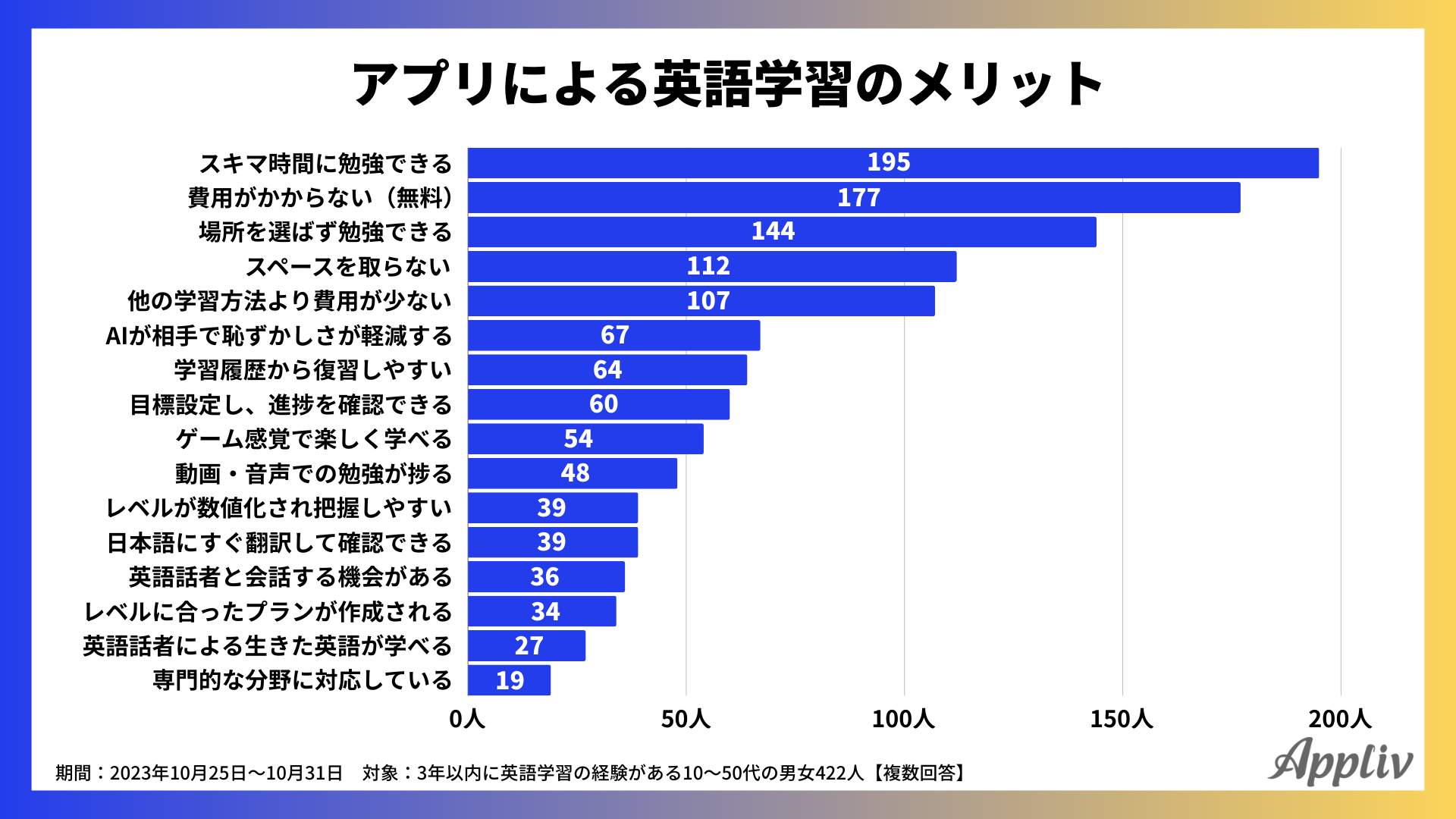 今回の調査の結果、英語話者との交流を楽しむために学習している社会人にとって、アプリが継続しやすい学習方法であることが分かりました。アプリでの英語学習は、時間を有効活用でき、場所を選ばない点や、他の学習方法よりも安価で取り組めることがメリットだと言えます。