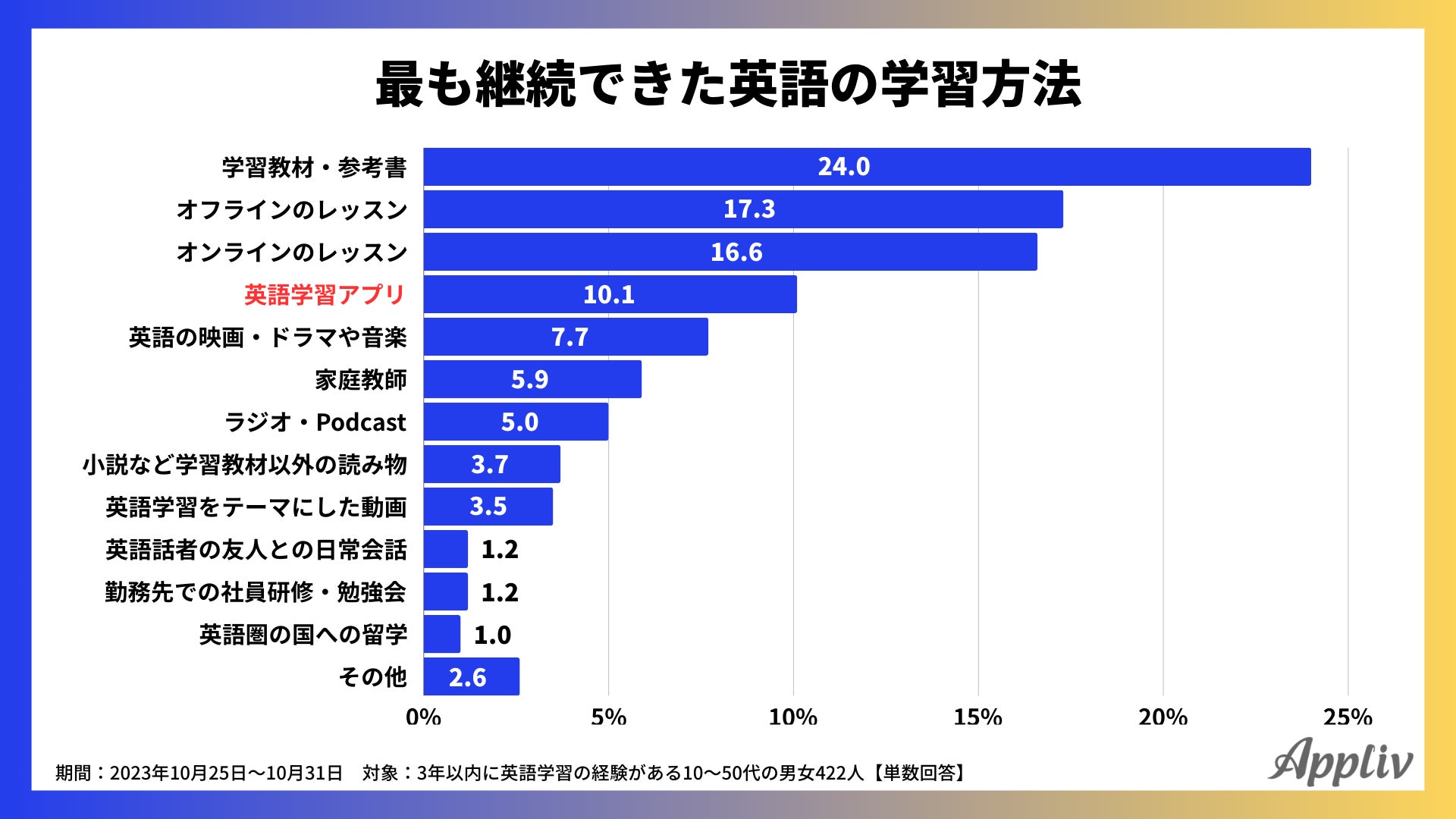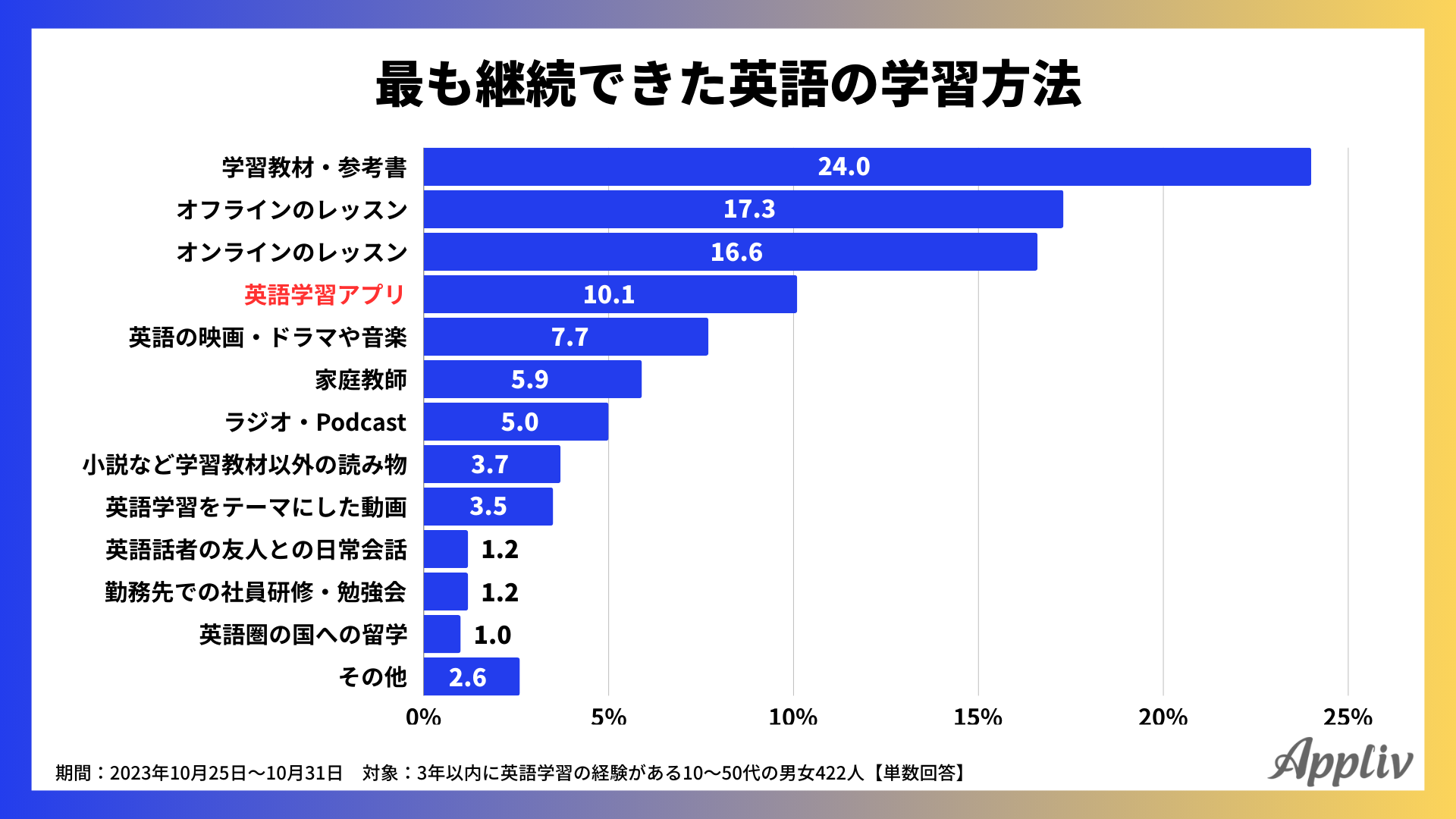 社会人が最も継続できた英語学習方法、「アプリ」は4位