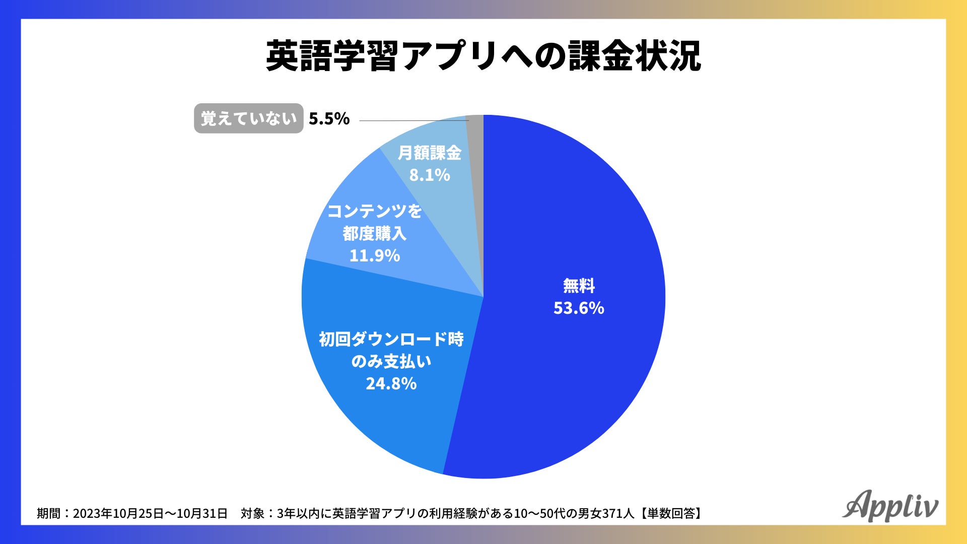 英語を学習する際にアプリを利用した人に対し、課金状況を聞いてみたところ、最も多かったのは「無料(53.6%)」でした。